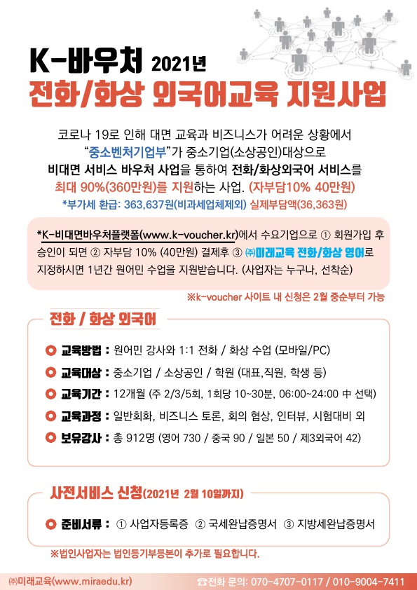 | 첨부파일 : FILE K-비대면 바우처 전화화상영어_(주)미래교육 (2)_1227511447575781.pdf |