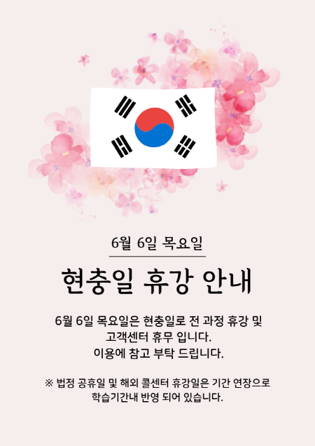 | 이전글 ▼ | 2024년 5/6,15일 휴강 및 휴무 안내 | 관리자 | 2024-05-03 | 6311 |